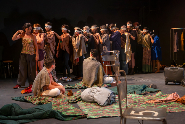 A encenação aposta na teatralidade explícita e na sugestão em lugar da representação literal, um convite a completar o que não se mostra. Em determinados momentos, o público é integrado à ação: pessoas são vendadas e inseridas na cena como novos grupos de cegos que chegam ao manicômio, o que modifica a relação entre quem assiste e o que é encenado, aproximando ficção e realidade.